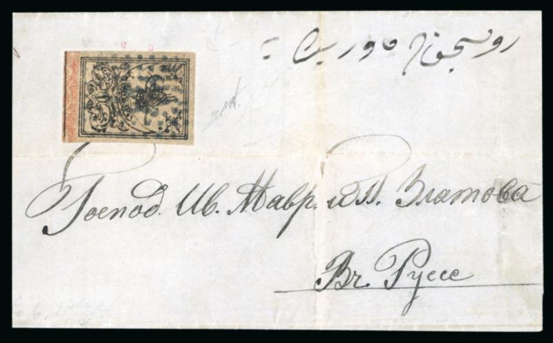 1864 (Sep 21) Turkey 1p stamp black on grey on letter Cuma-i Atik to Rustschuk, with very rare Cuma-i Atik cancellation with very few examples known. A very fine letter with vertical file fold clear of adhesive; cert. Ottoman Philatelic Society and Nakri (2019). (Image)