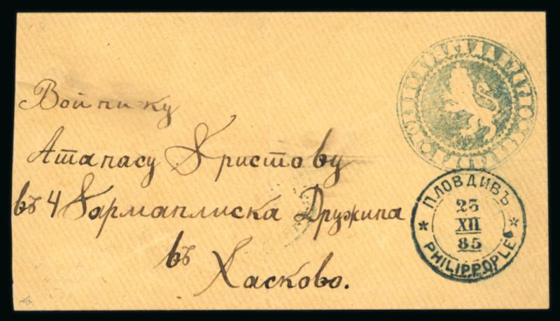 1885, Envelopes (2) after reunion with Bulgaria showing in blue the lion seal + Philipopple 12.12.85 and 25.12.85 cds to Rachovo, these 2 envelopes with their lion cachet of MILITARY COMMANDER PLOVDIV are sort of cto markings nevertheless very rare (Image)