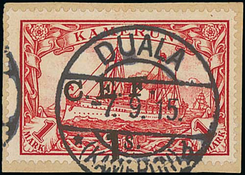 1915 1s, 2s, 3s and 5s Surcharges used on separate pieces, with Duala (7.9.15) datestamps, 3s with small corner fault, otherwise fine and scarce. S.G. 10/13, £4,000. (4). Photo on Page 120. (Image1)