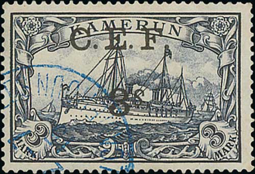 1915 3s on 3m, variety "S" inverted, used with part violet "Tresor et Postes aux Armees Cameroun" c.d.s, signed on reverse by Houtzhamer. A very scarce variety, probably unique with the French army c.d.s. S.G. 12a, £4,000. Photo on Page 120. (Image1)