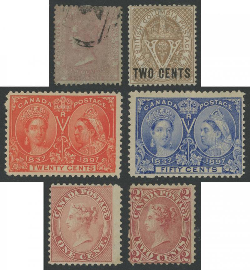 Dealer's stockbook of QV to KGV issues mostly used with British Columbia & Vancouver Island 2½d; British Columbia 'TWO CENTS' on 3d mint; highly catalogued Newfoundland; Province of Canada ½c mint, 10c x5, 12½c x7 & 17c x4, 2c x3 (one unused), Dominion Large Queens 1c orange-yellow, 6c x6, 12½c x6 & 15c x13, Thin Paper 5c SG 106 unused, 1893 Widow's Weeds 20c x3 & 50c x4, Jubilee incomplete unused to $1 & used to $2 (faded), KEVII 50c mint (egregious centring), Quebec Tercentenary sound set, useful Admirals including 1922-31 1c 2c & 3c Imperf Blocks of 4 (*/**), 50c Bluenose x8; etc, condition variable but many are fine to very fine, nothing has been expertised so necessarily offered "as is".