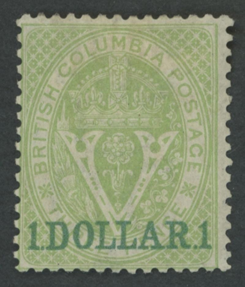 BRITISH COLUMBIA: 1868-71 Surcharges Perf 14 '1.DOLLAR.1' in Green on 3d green SG 33 (Scott 13), small-part gum with hinge remainder, Cat £1500 (US$2000). Unissued. (Image1)
