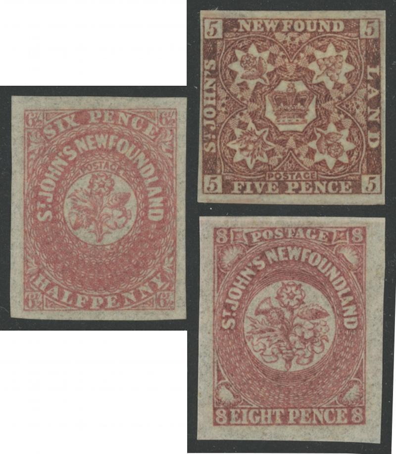 NEWFOUNDLAND: 1862-64 New Colours Crown & Flowers Imperforate 4d rose-lake, 5d chocolate-brown, 6d rose-lake, 6½d rose-lake, 8d rose-lake & 1/- rose-lake (marginal) SG 18-23 (Scott 18-23), most with good to large margins, large-part gum, Cat £555 (US$340+).