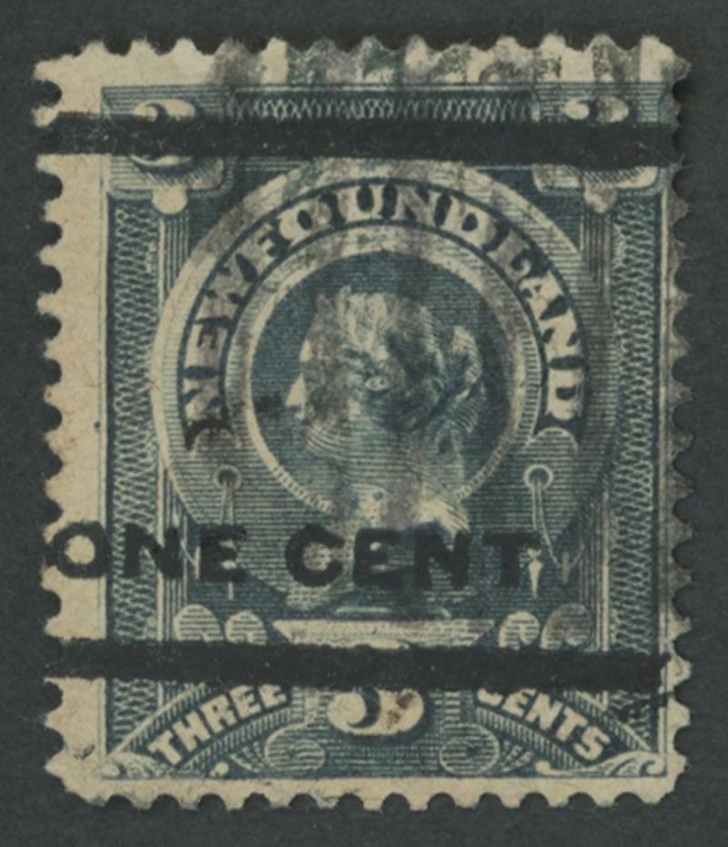 NEWFOUNDLAND: 1897 'ONE CENT' on 3c with Sans Serif Font SG 82, light bars cancel, Cat £500. (Image1)