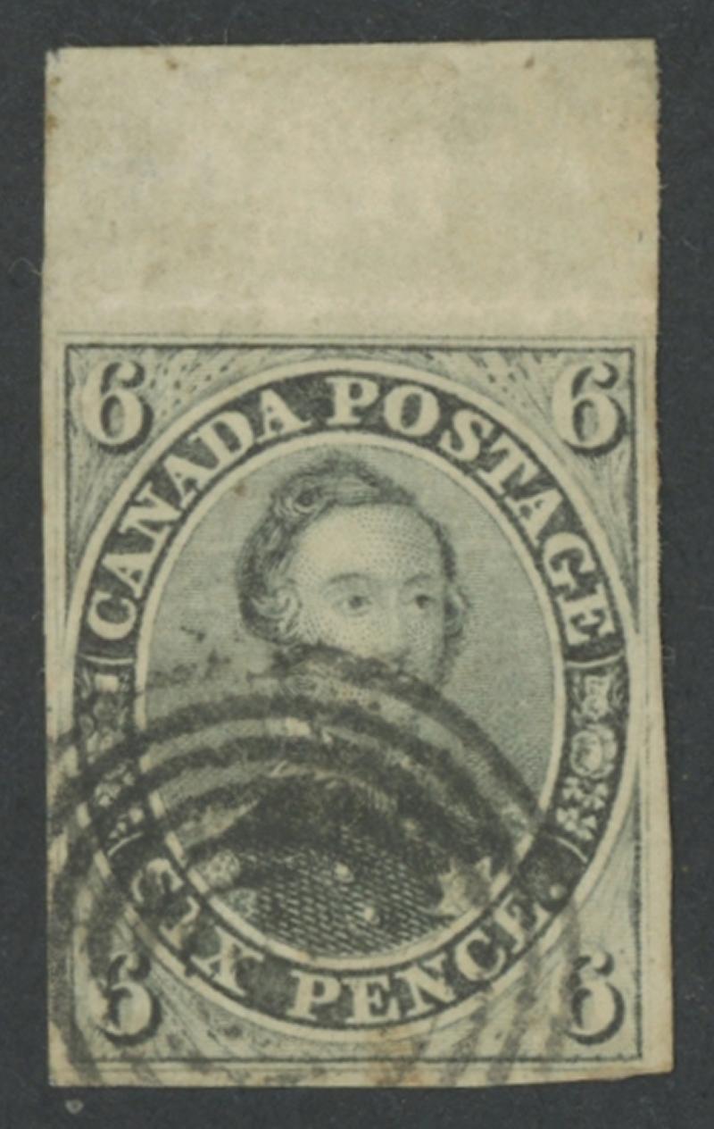PROVINCE OF CANADA: 1852-57 Imperforate Prince Albert 6d greenish-grey on Handmade Wove Paper SG 10 (Scott 5), margins good to large with sheet margin at top, light horizontal fold in the sheet margin well clear of the design, a couple of shallow thins in the margins only, neat circle-of-rings 'target' cancel, Cat £1400 (US$1150). (Image1)