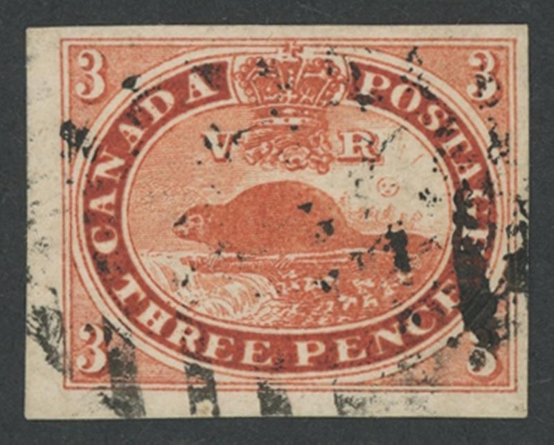 PROVINCE OF CANADA: 1852-57 Thin Wove Paper Imperforate Beaver 3d orange-red SG 8 (Scott 4d), margins good to large, concentric rings cancel, Cat £275 (US$225). (Image1)