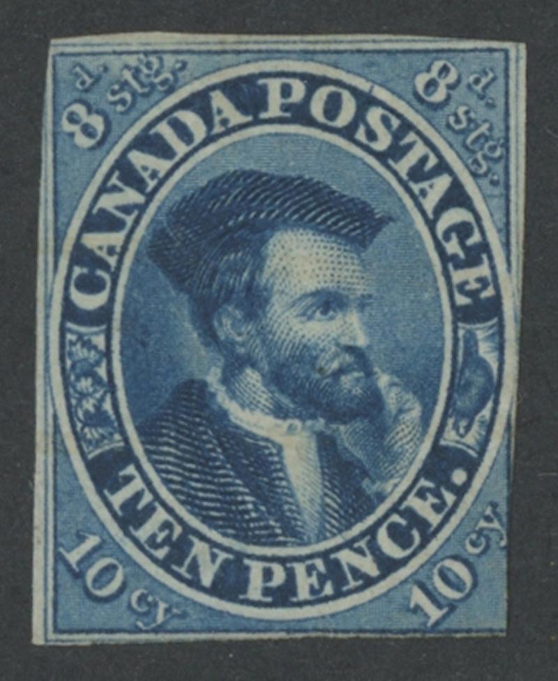 PROVINCE OF CANADA: 1852-57 Imperforate Cartier 10d bright blue on Medium Wove Paper SG 20 (Scott 7), margins close to just cutting the outer frame-line at base and touching the design at lower-left, unused, Cat £16,000 (US$15,000). RPSL Certificate (1943) as the then SG 20B states "genuine but regummed". (Image1)