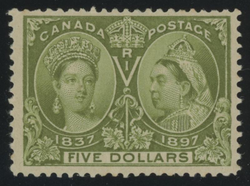 1897 Queen Victoria's Diamond Jubilee $5 olive-green SG 140 (Scott 65), lightly mounted with small patch of gum loss around the hinge mark, Cat £1500 (US$1300). (Image1)