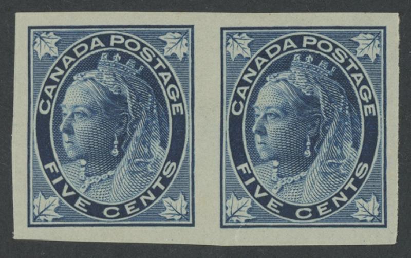1897 Queen Victoria Maple Leaves 5c deep blue/bluish Imperforate Horizontal Pair SG 146a (Scott 70a), tiny hinge remainder, Cat £475 (US$525). RPSL Certificate (2012). (Image1)