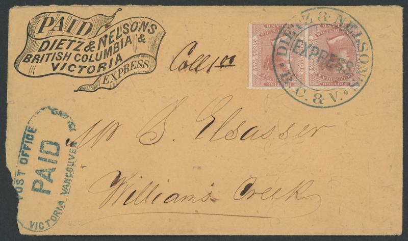 POSTAL HISTORY: 1865 (circa) Dietz & Nelson's British Columbia & Victoria Express envelope with 'PAID' ribbon frank [DIE-002] in black at upper-left, to William's Creek with British Columbia & Vancouver Island 2½d pale rose (SG 3; Cat £200 each used) horizontal pair tied by 'DIETZ & NELSON'S/EXPRESS/B.C. & V.' circular handstamp in blue, 'POST OFFICE/PAID/VICTORIA VANCOUVER ISLAND' undated oval cachet at lower-left, endorsed "Coll 1.00" in manuscript alongside the adhesives, a little roughly opened at lower-left just affecting the 'PAID' cachet and some pencil annotations on the reverse. Gibbons states that after decimalisation the 2½d values were sold at 5c, but that between May-November 1865, they "were used to to prepay mail from Vancouver Island to British Columbia at the price of 15 cents a pair". The $1 express fee was collected by Barnard's Express for carriage of the letter from Yale to the mining area of Williams Creek on the Cariboo goldfields. An attractive combination express usage. (Image1)