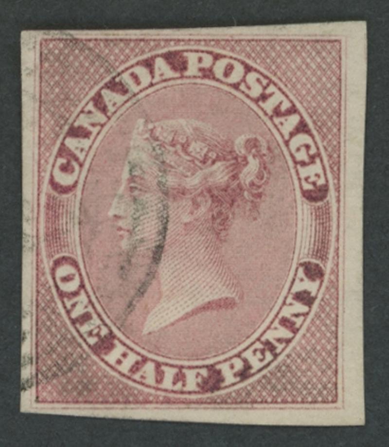 PROVINCE OF CANADA: 1857 Wove Paper Imperforate QV ½d rose SG 17 (Scott 8), margins good to large, light but indistinct numeral cancel, Cat £650 (US$700). (Image1)