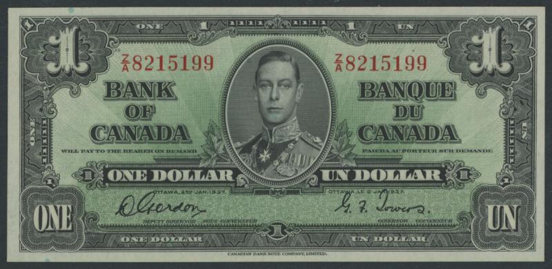 1937 KGVI $1 Gordon/Towers Pick 58d, serial 'Z/A 8215199', a couple of very light teller bends otherwise Uncirculated. (Image1)