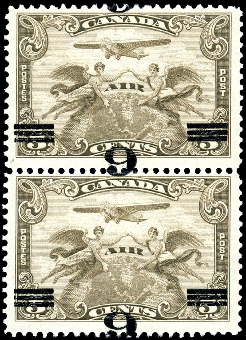AIR MAILS: C3a: 1932 6¢ on 5¢ vertical pair with INVERTED SURCHARGES lh, very fine. 1966 BPA Cert (Image)
