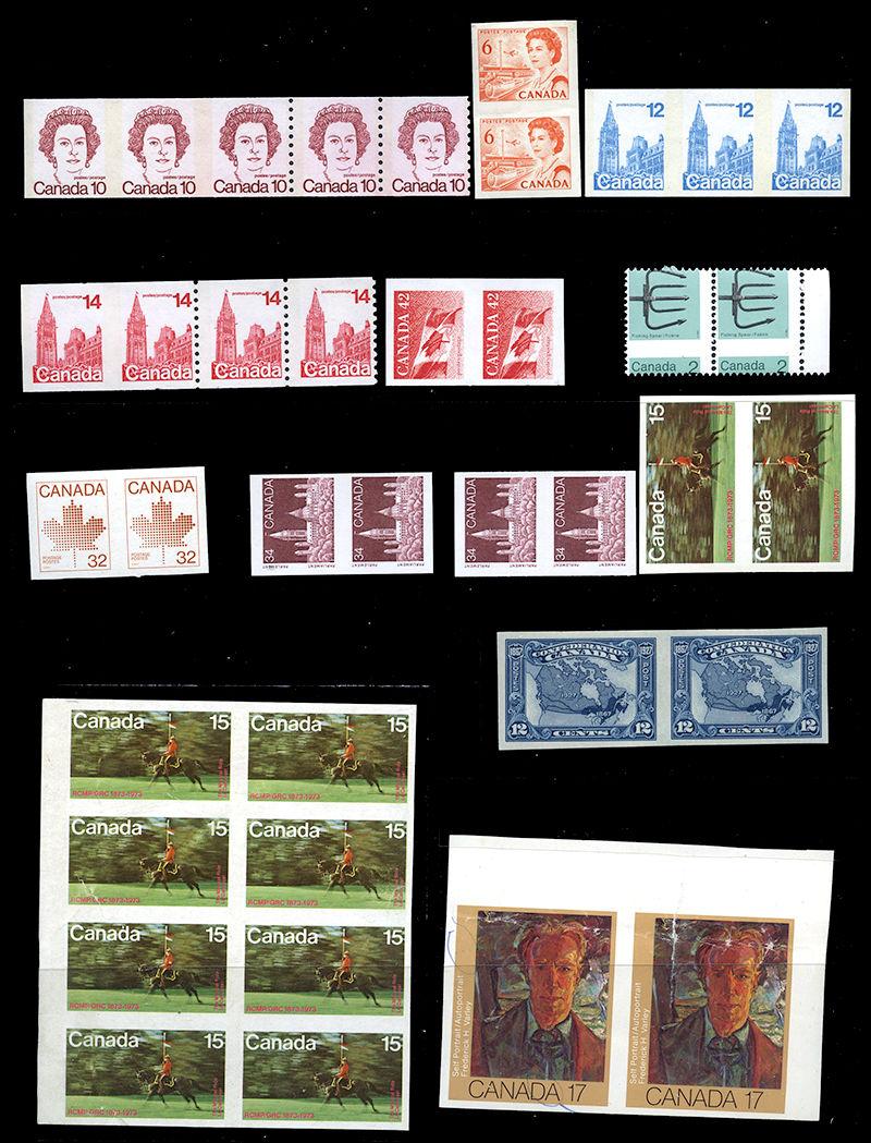 Collection of hundreds of mostly used 1859 to 1954, including 10¢ Small Queen shades, mint Jubilees to 50¢, 10¢ Mount Hurd IMPERFORATE PAIR, 1927 Special Delivery horizontal pair IMPERFORATE VERTICALLY, 12¢ Parliament IMPERFORATE PAIR, mint and used 8¢ Registered, varieties with 1935 10¢ Mountie used BIRDCAGE, BOB, some auction lots still on original sheets, etc. Inspect.