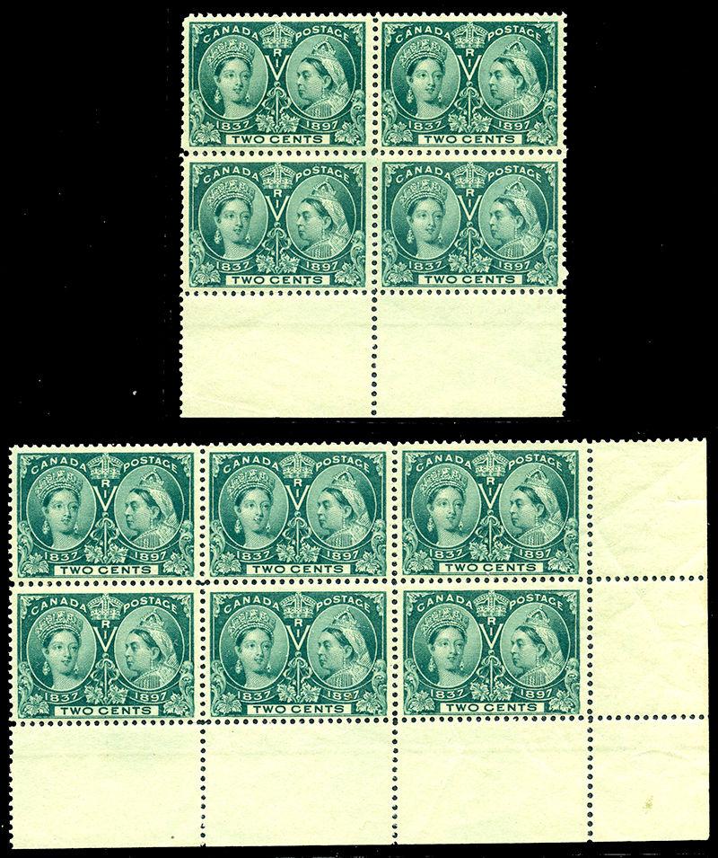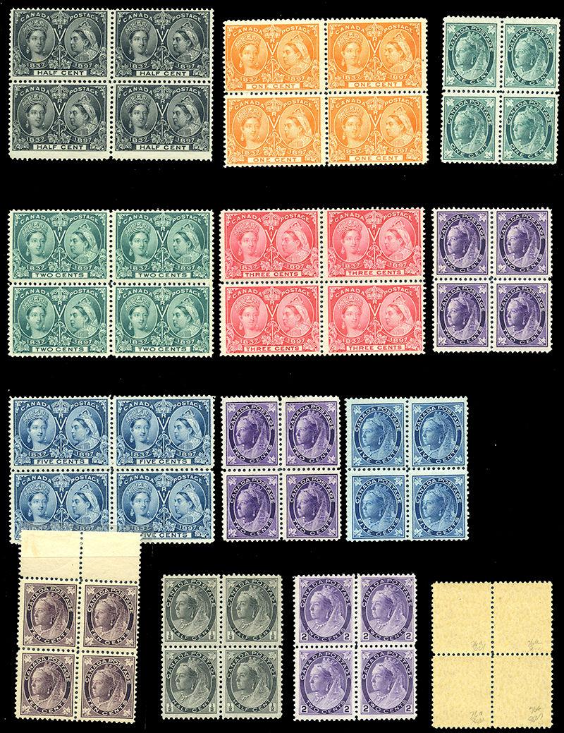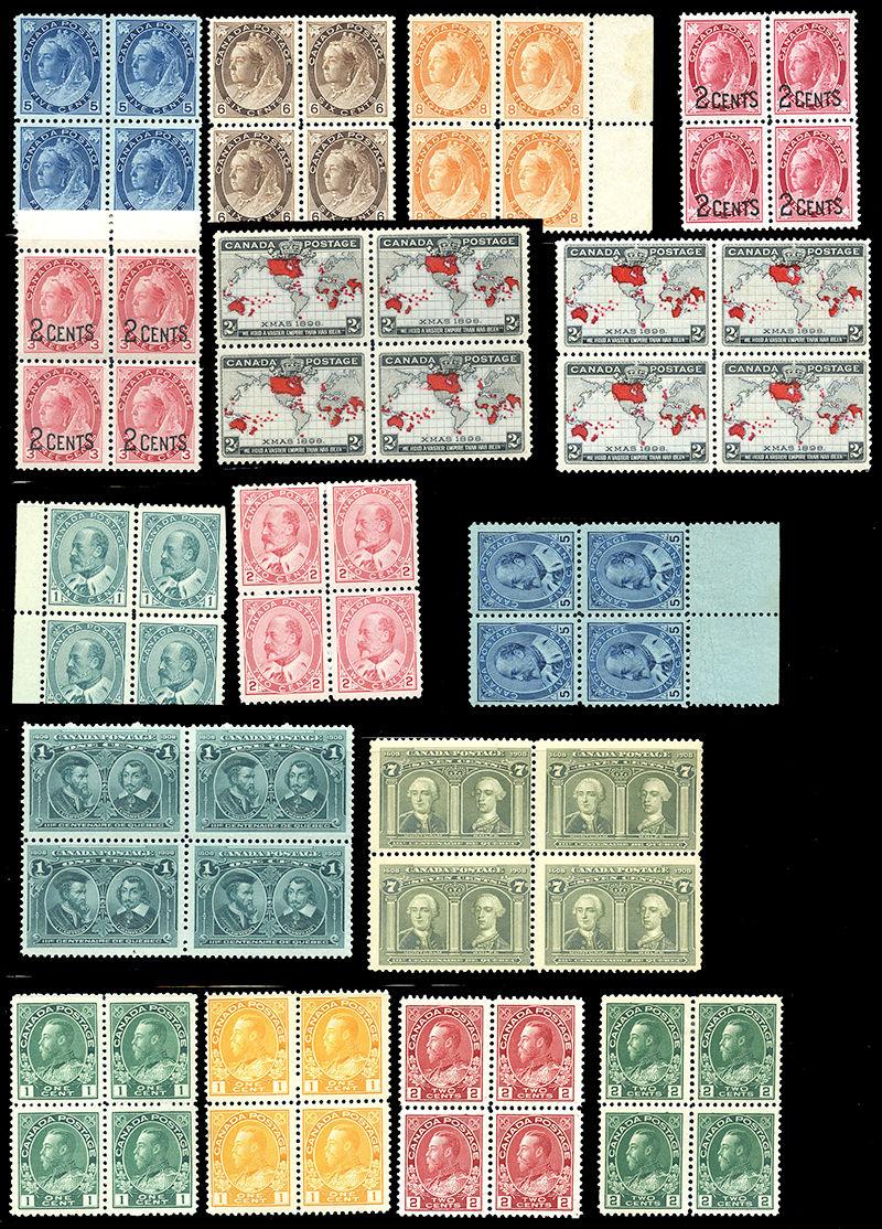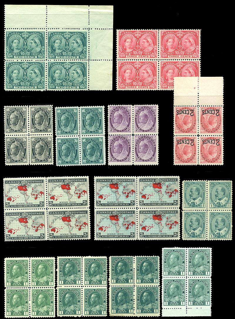 Six blocks including 2¢ Jubilee of 4, 6, and 10, ½¢ Numeral of 35, 1917 Confederation of 20 (separating), 2¢ Admiral yellow green of 10, some light wrinkles or bends, all nh, f-vf. Cat as nh fine only (Image)