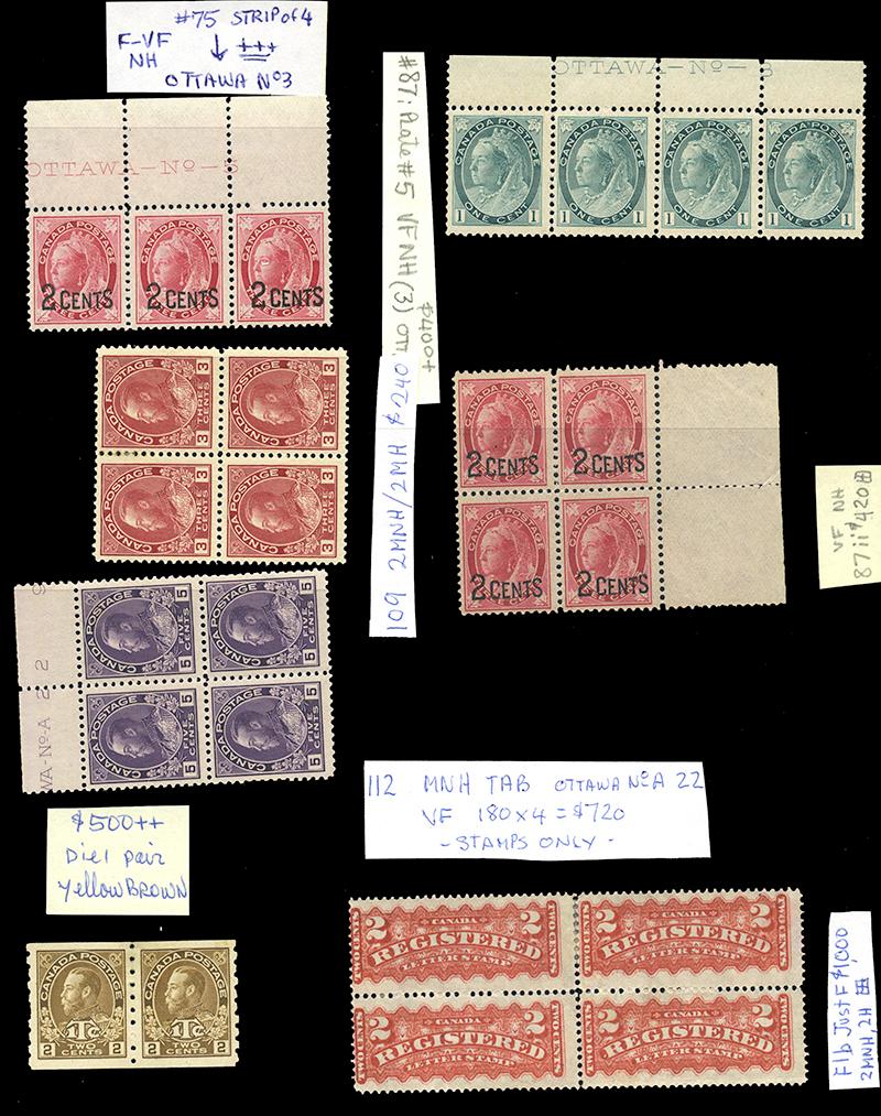 15/15P/OX4: Dealer’s stock of mint and used in 6 stock / counter books and pages, Victoria to early Elizabeth II, including Admirals, coils, booklet panes, (noted MR7 single with starter strip and 106 top margin block with hairlines, cat for Admirals $2868), also strength in coils George V on, many with start and end strips, PWF6 pane of 5 (NH, creased), earlier with faults, Officials, Airs, many NH, but majority hinged, huge amount of last printing Dues not included in totals, plus Newfoundland 36/C19, mainly used, Cat Val $1325. Inspect
