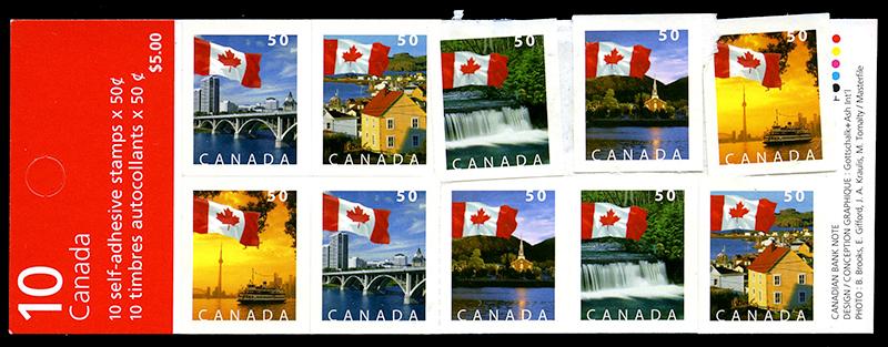BK302Ab: 50¢ Flag pane of 10, COVER PRINTED ON GUM SIDE, 3 stamps removed and but back (Image)