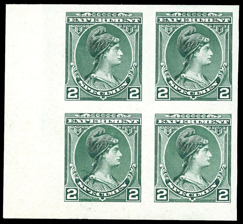 AMERICAN BANK NOTE ‘EXPERIMENT SPECIMEN’ PLATE ESSAYS, GREEN on white gummed paper, LL corner block of four, nh, scarce and very fine. (Image)