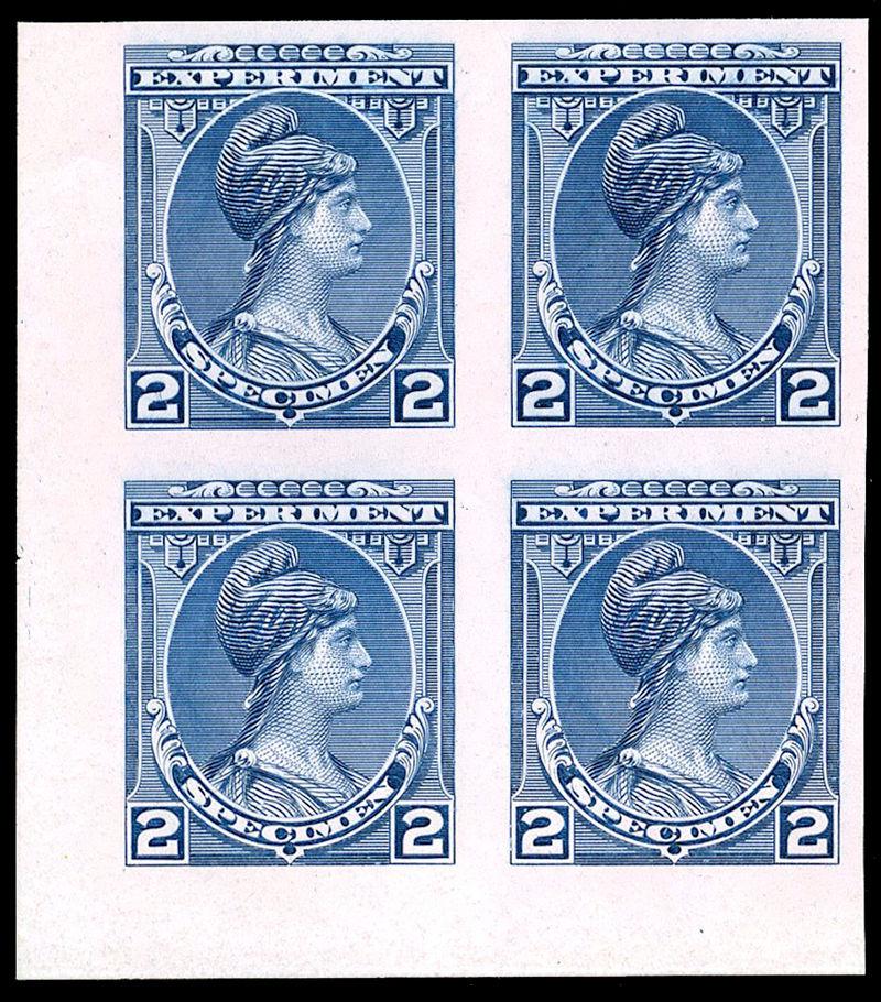 AMERICAN BANK NOTE ‘EXPERIMENT SPECIMEN’ PLATE ESSAYS, BLUE on PINK ungummed paper, LL corner block of four, scarce and very fine. (Image)
