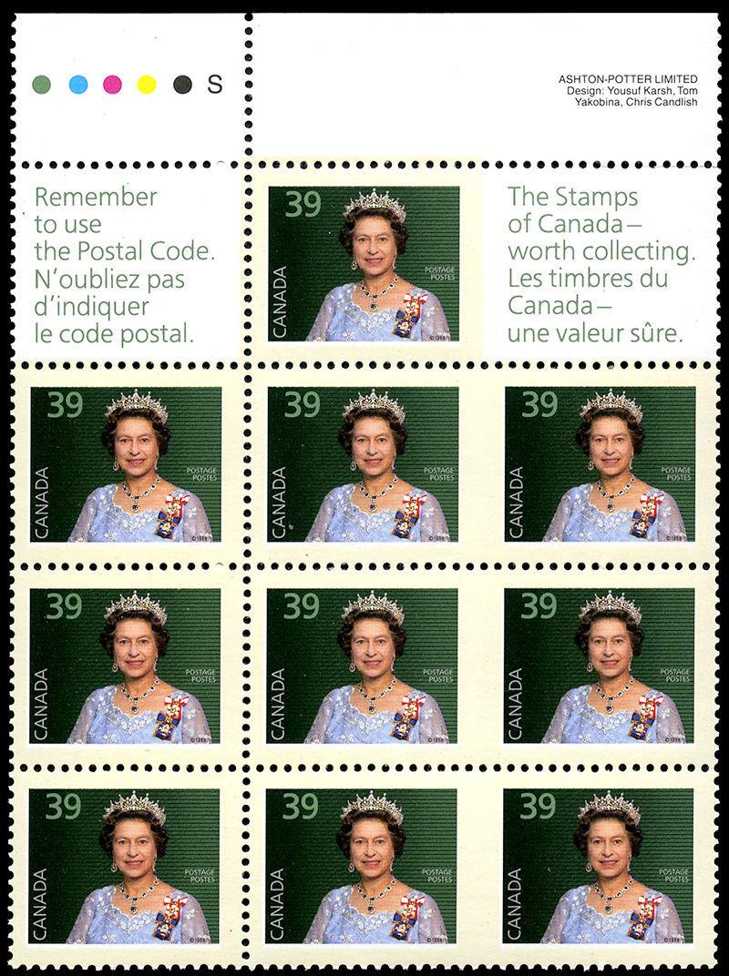 1181var: $1 Runnymede, UL corner margin block of 8(2x4), UL vertical strip of 3, and top margin block of 8(2x8), all with SHIFTED INSCRIPTION reading “CANADA $”, nh and very fine (Image)