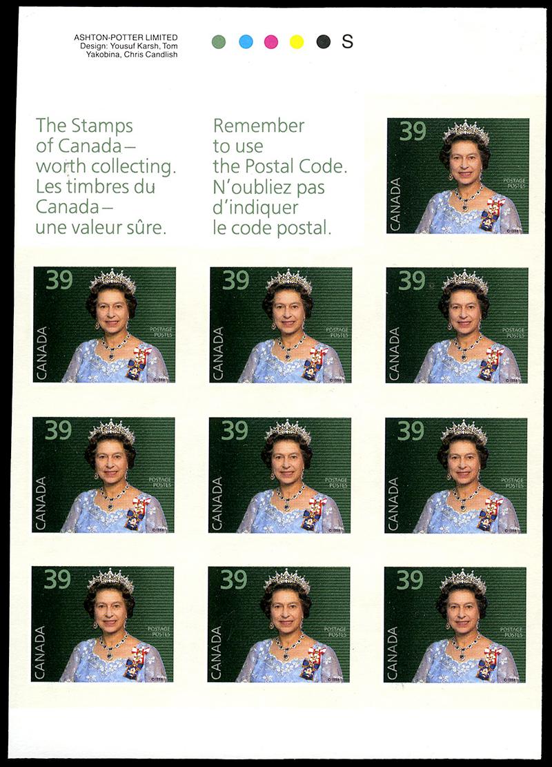 1167c var: 39¢ Elizabeth booklet pane of ten, right margin UNCUT IMPERFORATE BLOCK OF EIGHT PANES, with SIXTEEN HORIZONTAL IMPERFORATE PAIRS (1167c) and SIX IMPERFORATE PLUS LABEL (newly listed 1167ci), some light wrinkling and offset, otherwise nh, mostly very fine (Image)