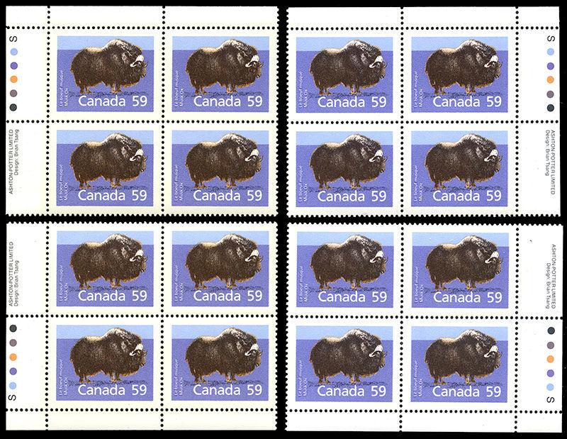 1174i: 59¢ Musk Ox, on Slater paper, perf 14.4x13.8, in matched set of 4 PBs of 4, nh, very fine (Image)