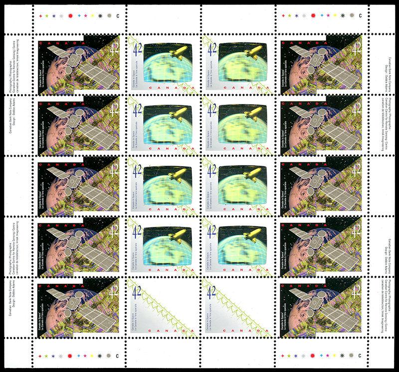 1442b: 1992 CANADA IN SPACE, complete sheet of 20 with bottom TWO MISSING HOLOGRAMS, nh, very fine. 2008 Greene Cert (Image)