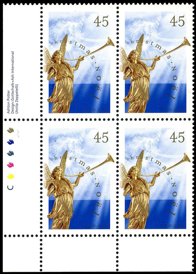 1764b: 45¢ Angel, PERF 13.1 x 13.6, LL Plate block of four, nh, very fine (Image)