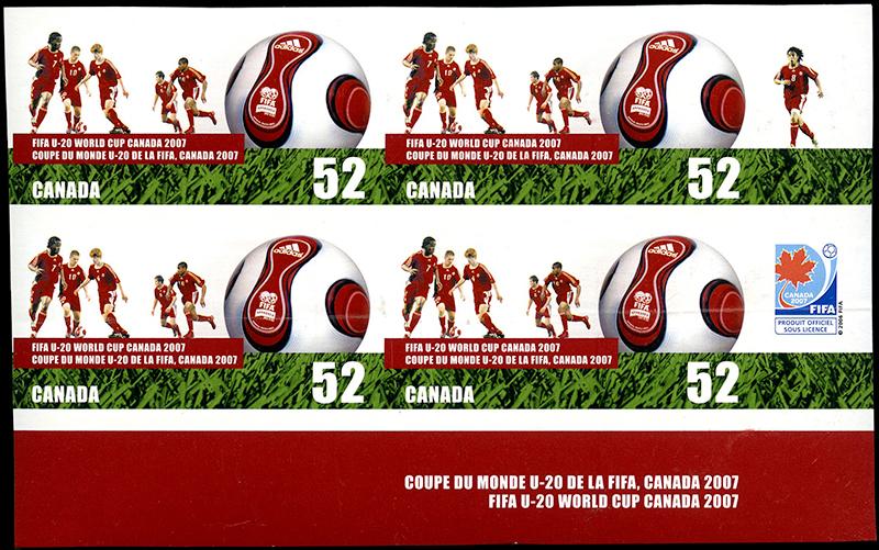 2220a: 52¢ FIFA U-18 World Youth Championships LR IMPERFORATE CORNER BLOCK OF FOUR, light horizontal crease through bottom pair, nh (Image)