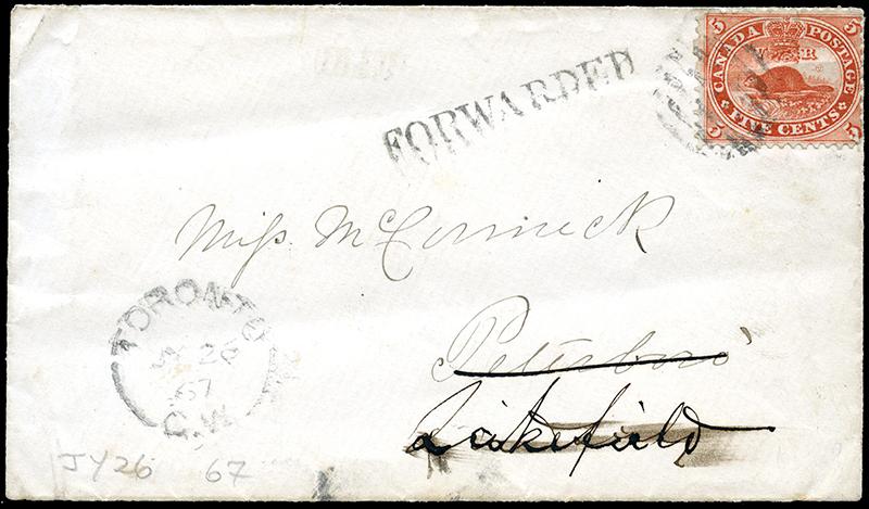 15: FIVE CENT: VERMILION, tied by diamond grid cancel, TORONTO C.W. 26 JY 67, 22mm A2 split circle to Peterborough, crossed out / Lakefield, FORWARDED hand stamp, NORTH DUORO CW. 2? JY 67 small split circle receiver. (Image)