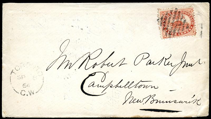 15: FIVE CENT: VERMILION, tied by diamond grid cancel, TORONTO CW 8 SP 64 A2 and MONTREAL AM SP 9 64, by coastal boat to SAINT JOHN NB 14 SE, CHATHAM NB 16 SP transits, CAMPBELLTON NB 17 SP receiver. This letter clearly did not go via the Matapediac route where a new road was opened in 1864. [Robson Lowe Vol V, p324]. A very long way round. Part of back flap missing. (Image)