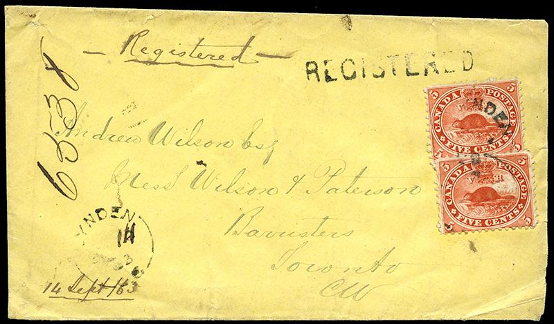 15: FIVE CENT: VERMILION, two tied to each other by LYNDEN 14 SE 1863 U.C broken circle to Toronto, REGISTERED straight line, G.W.R. EAST 14 SP RPO, and same day receiver on reverse, opening tears and trimmed at right. (Image)