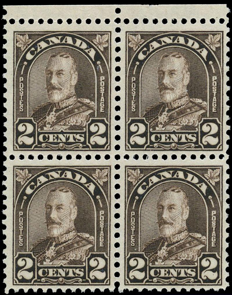166b var: 2¢ dark brown, die I, block of 4 with DOT IN 2 in LR stamp, nh, very fine (Image)