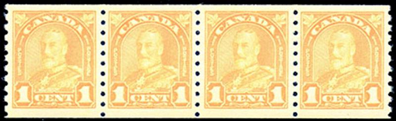178: 1¢ Arch orange coil strip of 4, nh, very fine. (Image)