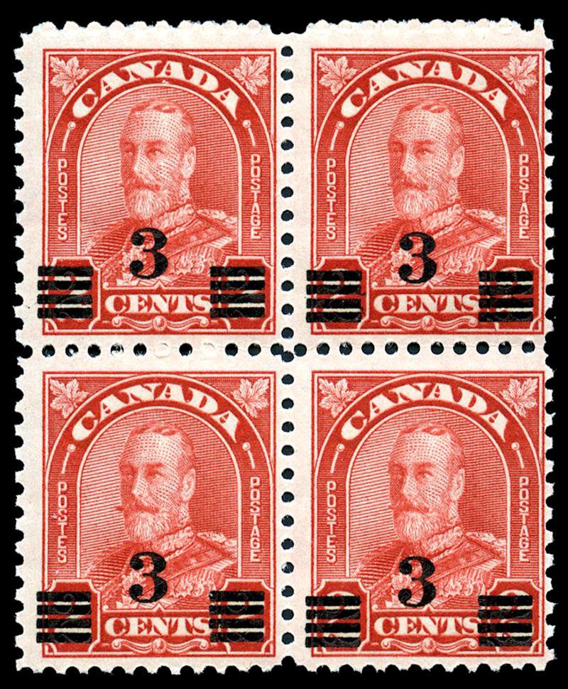 191i: 3¢ on 2¢ deep red, Die II, block of four with EXTENDED MOUSTACHE , variety nh, fine (Image)