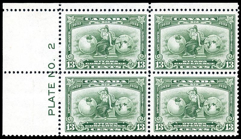 192,i: 3¢ deep red Ottawa Conference, bottom margin block of six, the top middle stamp with BROKEN E variety, nh and fine (Image)