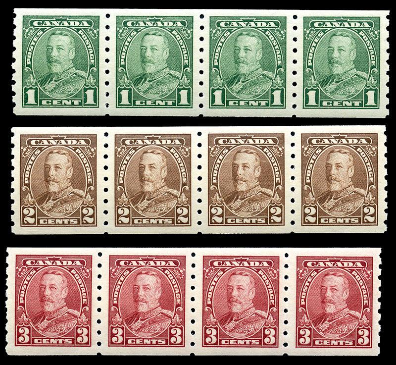 228-230: 1935 George V coils, in strips of four, nh, superb (Image)