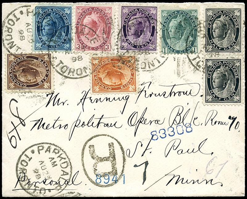66-72: ½¢ pair to 8¢, all tied by large part Parkdale 23 AU 98 Toronto (#) 2 duplex cancels on Registered cover to St Paul Minn (USA), same day Toronto transit, full duplexes, blue RECEVIED 25 AUG 1898 Chicago Il handstamp, St Paul 26 AUG receiver on reverse. colourful. (Image)
