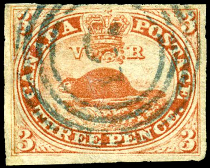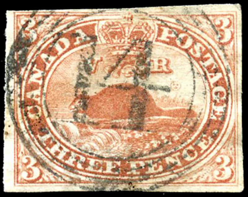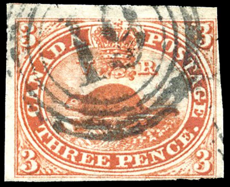 4iii: THREE PENCE: on RIBBED HARD WOVE PAPER, 4-RING-5 (Brantford, U.C. RF 3), full to large margins, very fine (Image)