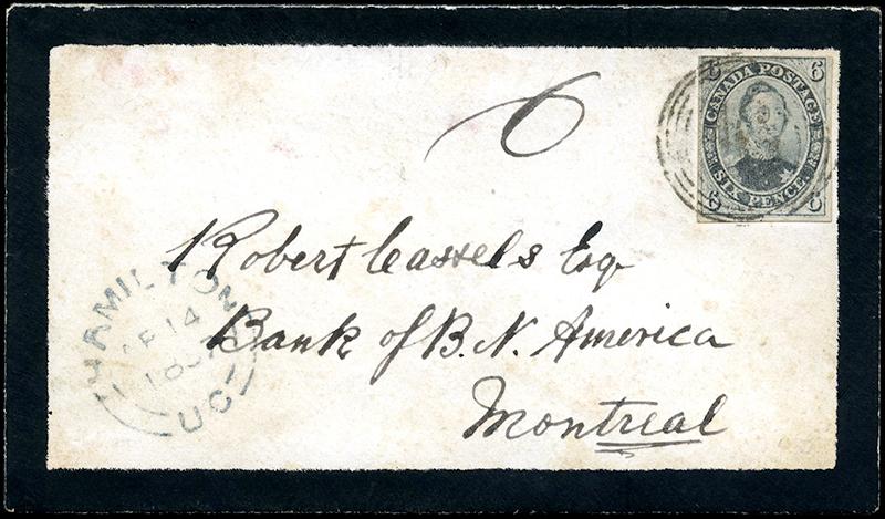 5: SIX PENCE: SLATE GREY, tied to small mourning cover by 4-RING-16 (Hamilton, U.C. RF 10), HAMILTON U.C. 14 AP 1867 double broken circle to Montreal, 17 AP receiver, part of back flap missing and some toning. (Image)