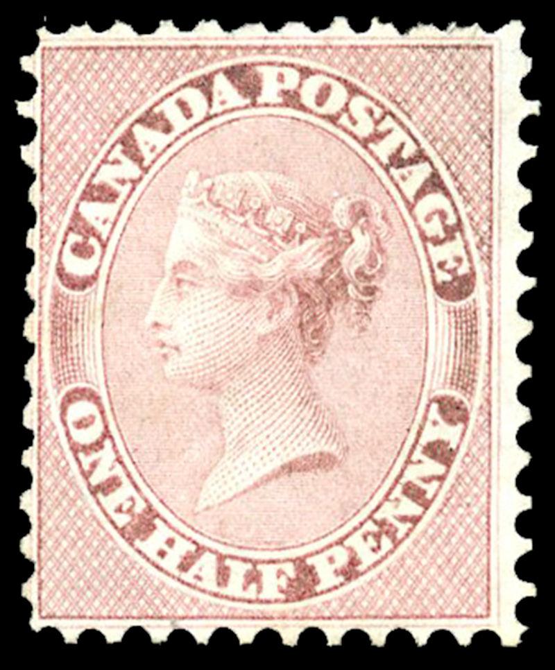 11: PERFORATED HALF PENNY: ROSE, perfs into at right and showing part of stamp at left, SON 4-RING-12 (Dundas, U.C. RF 8), creased, and ink annotations on back. (Image)