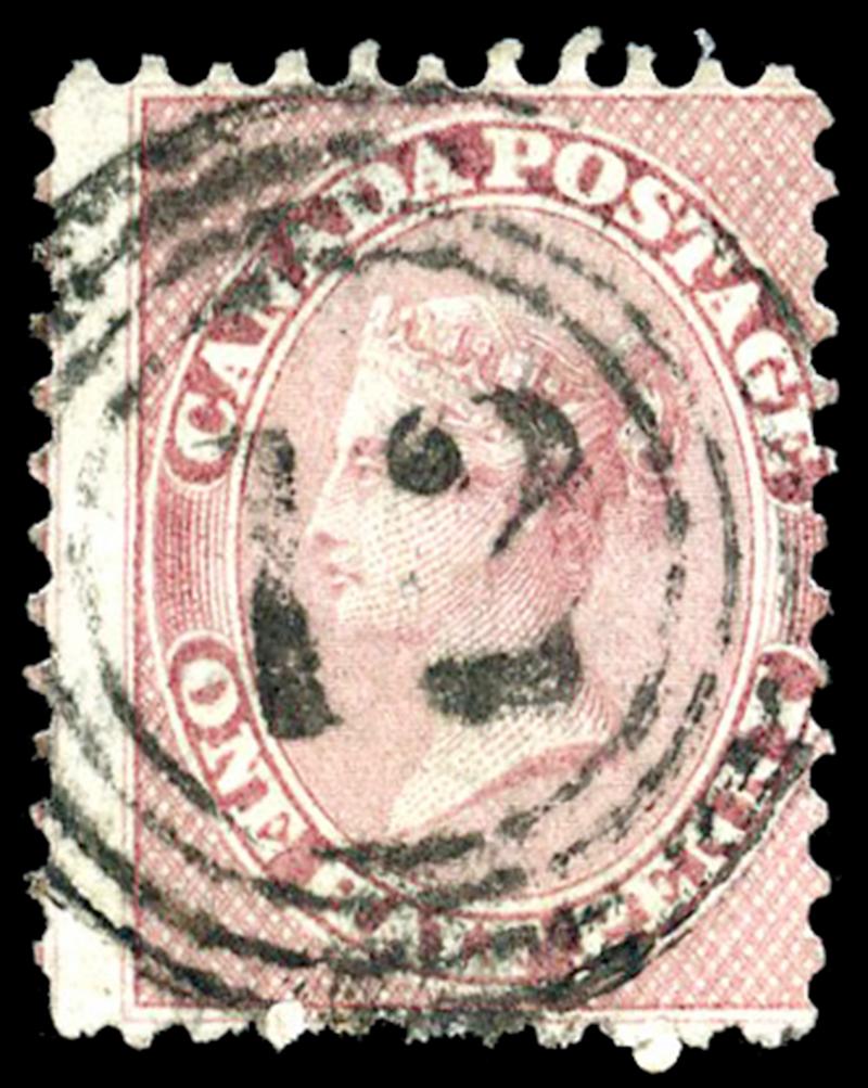 4: THREE PENCE: RED, clear to full margins, SON 4-RING-14 (Goderich, U.C. RF 7) (Image)