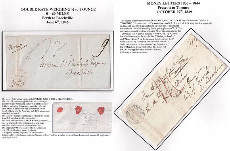 POSTAL HISTORY - STAMPLESS: Twelve MONEY LETTERS 1839 to 1849 neatly mounted on pages, including Amherstburg to Montreal paid 5/10, Kingston local without rate, Toronto to Montreal rated 3/6, Perth to Brockville rated 2/3, Fort Erie to Kingston rated 2/4, Toronto to Montreal too late rated 1/1½d, Hamilton to Montreal rated 1/4, Perth to Brockville rate 9d, Prescott to Toronto rated 2/9, Niagara to Brantford rated 7d, Oakville to Hamilton 4½, Goderich to Toronto rated 2/3, generally fine or better. (Image)