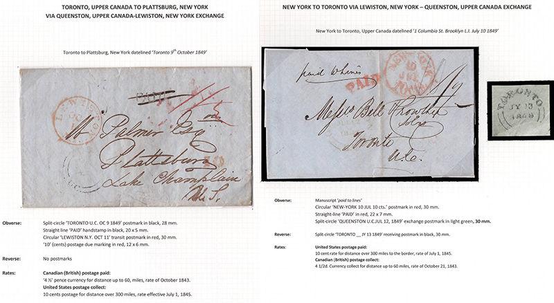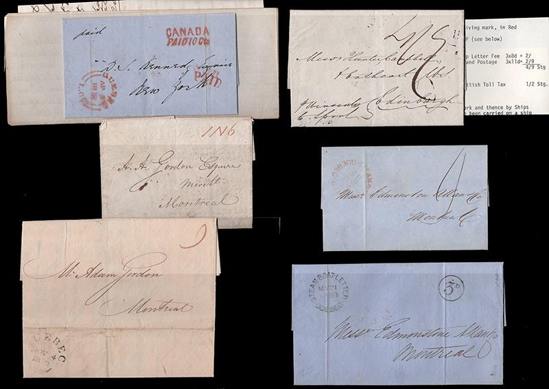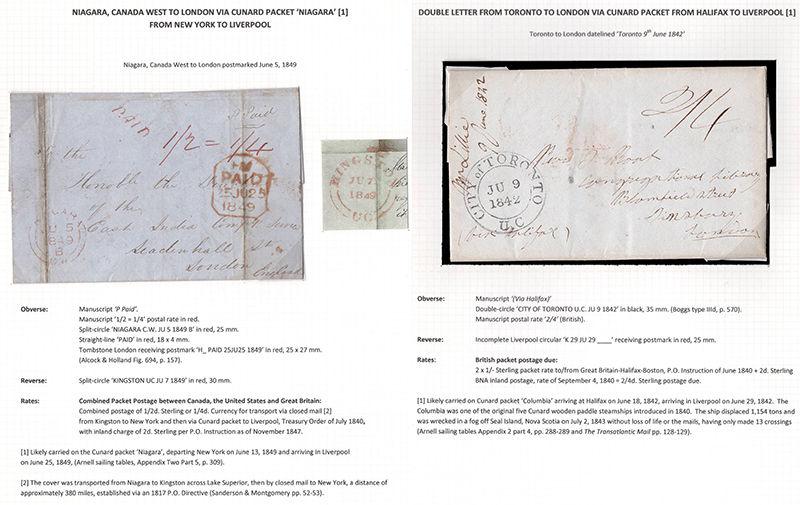 POSTAL HISTORY - STAMPLESS: Nine TRANSATLANTIC LETTERS, 1842 to 1857 incoming and outgoing, neatly mounted with extensive research and reference to Winter, Arnell and Robertson, various rate and accountancy markings, Cunard ships including Persia - England from and to Quebec, Montreal, Toronto and Niagara, mostly clean and f-vf. Inspect. (Image)