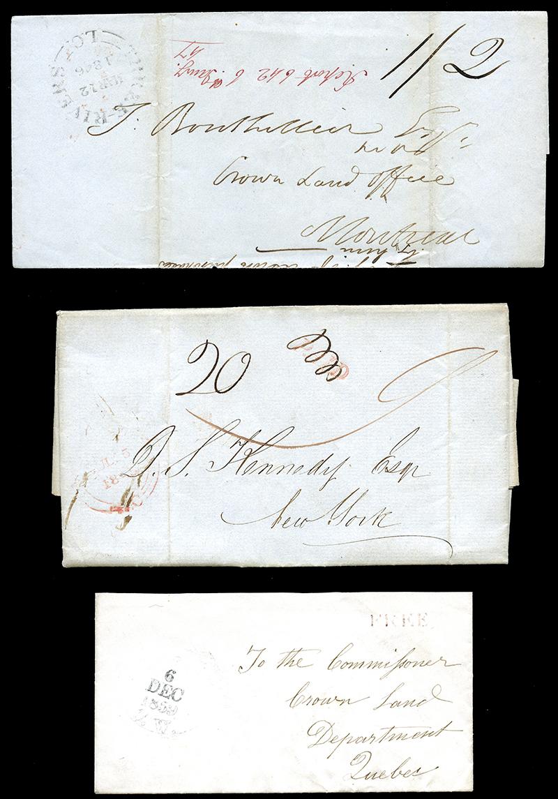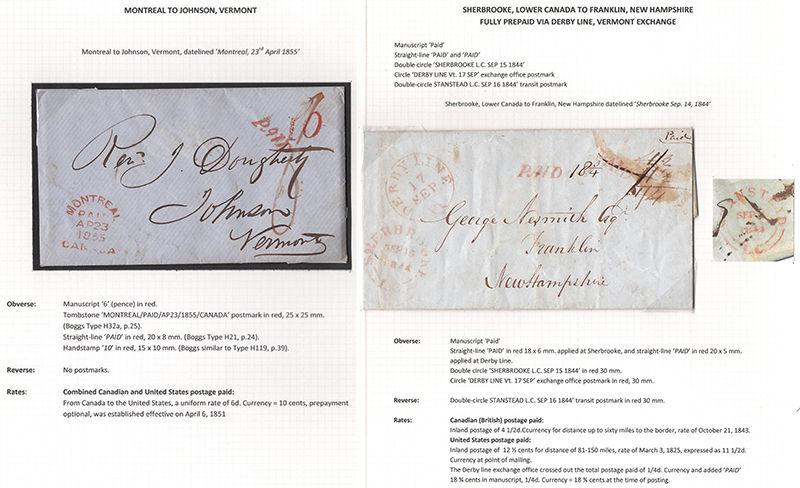 POSTAL HISTORY - STAMPLESS - LOWER CANADA: Ten LOWER CANADA letters, 1841 to 1856, neatly mounted, with domestic, cross border, money letters with Bytown to Montreal posted as a drop 1d, Sherbrooke to New Hampshire, Montreal half penny local, Montreal to Vermont, New Hampshire to Montreal, England to Quebec, Montreal to New York, Three Rivers money letter to Kingston and Three Rivers to Montreal. Many paid markings etc, clean f-vf.(Image)