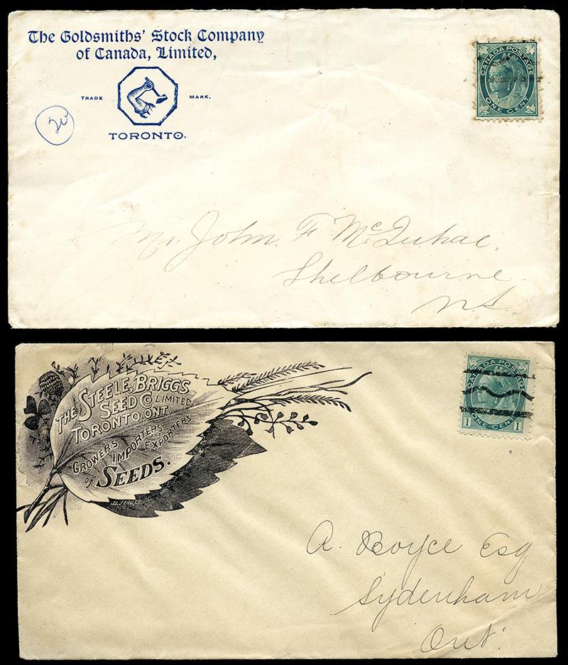 POSTAL HISTORY - ADVERTISING COVERS: T-67,T75: 2 covers with Toronto 2 T precancels, one 1¢ green Leaf, THE GOLDSMITHS’ STOCK COMPANY OF CANADA LIMITED, with Arm & Hammer trademark, partial SHELBOURNE N.S. 8 MR 99 receiver, ANSONIA CLOCK CO on back, flap missing; other on QV 1¢ green Numeral, THE STEELE, BRIGGS SEED CO LIMITED, TORONTO ONT ... with Leaf sprig cc. SYDENHAM ONT 9 AP 01 receiver. (Image)