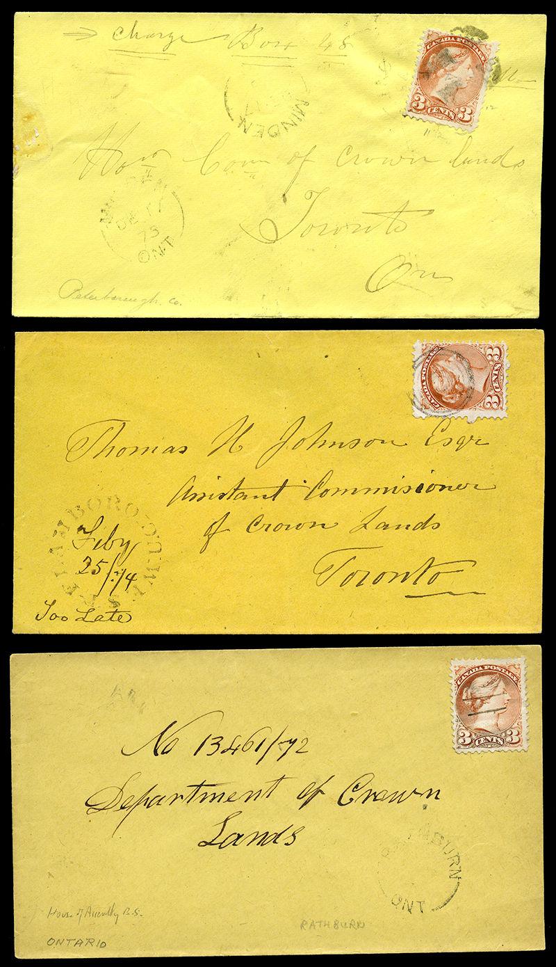 LEGISLATIVE MARKINGS - HOUSE OF ASSEMBLY - ONTARIO: HAO1: Five covers with 3¢ Small Queens, 1872 to 1893 all with HOUSE OF ASSEMBLY ONTARIO CROWN cancels, two from, 18? FEB 1892 to Owen Sound in green and 3 JAN 1893 to Brampton, and 3 to, Flamborough U.C. ms Feby 25/74 to Toronto 26 FEB 1874 in red, faint Rathburn Ont no date to Toronto 18 FEB 1874, and Minden Ont 17 DE 75 to Toronto 18 DEC 1875. (Image)