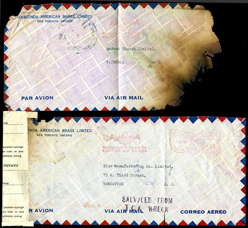 POSTAL HISTORY - DISASTER COVERS: Two metered covers from Anaconda American Brass Limited Toronto 7 IV 1954, one to Vancouver with SALVAGED FROM TCA WRECK (TCA Flight 9), and Post Office repair Seal, blue District Post Office Inspector 9 APR 1954 1 Moose Jaw, Sask. on reverse; the other to Victoria badly burnt LR and District Post Office Inspector INVESTIGATION 8 APR 1954 2 Moose Jaw, Sask. on reverse (Image)