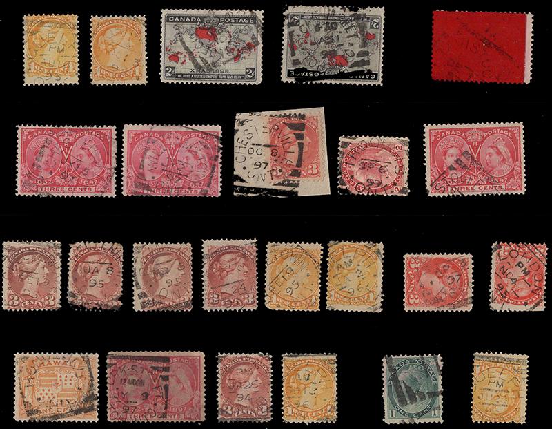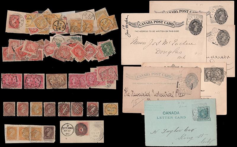 SQUARED CIRCLE CANCELS: OTTAWA SQUARED CIRCLE: and other postmark types on Small Queens to Jubilees, and stationery cards, Ottawa duplexes, Ottawa in grid, noting matching date, etc. Some minor faults to be expected. (Image)