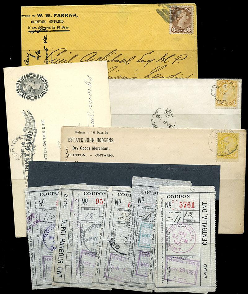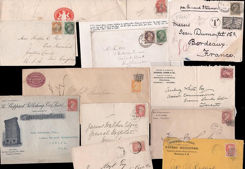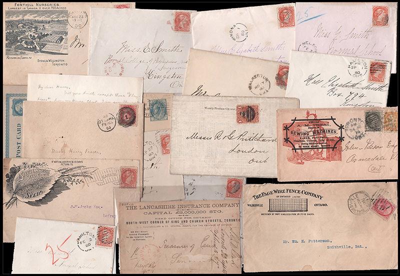 POSTAL HISTORY: Property as received with 250 Victorian era covers and cards including Large Queen, Small Queens with strength in Ontario markings, Stationery with P1, etc, some Jubilees, advertising, some stampless, etc, a myriad of postmarks, some machines. Condition varies, some cover fronts throughout. Inspect. (Image)